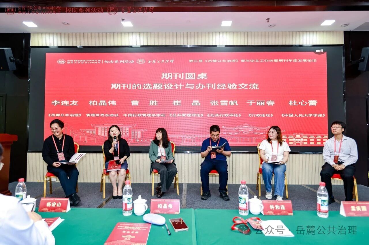 管理世界杂志社副总编辑柏晶伟编审,中国行政管理杂志社副社长、中国行政管理学会曹胜研究员,《公共管理评论》指导编辑、中央财经大学政府管理学院崔晶教授,《公共行政评论》编辑部副主任、中山大学政治与公共事务管理学院张雪帆副教授,《行政论坛》于丽春副编审,围绕期刊的选题设计与办刊经验做了深入交流与分享。期刊圆桌由《岳麓公共治理》主编、六间房
