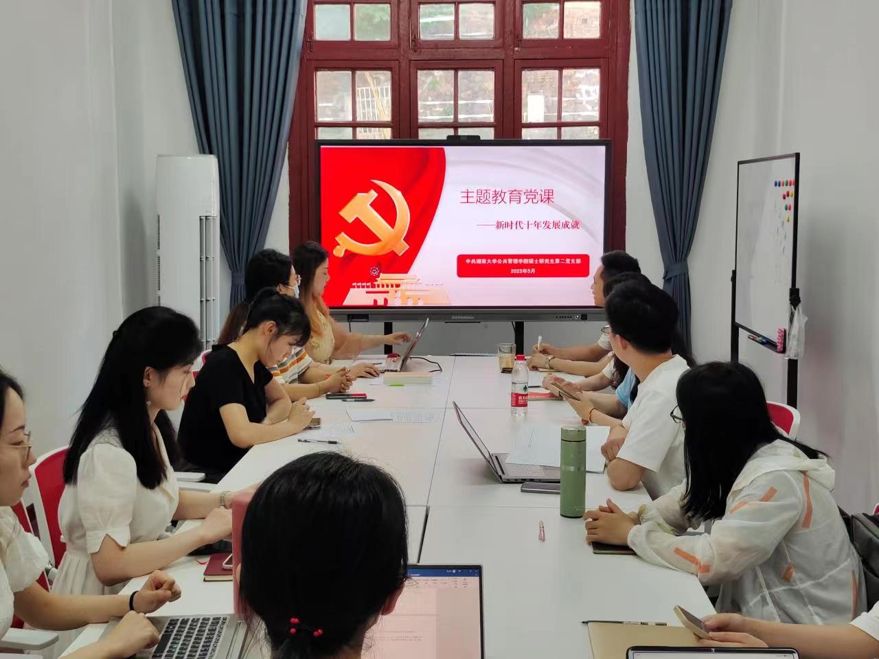 硕士研究生第二党支部在院楼214室召开新时代十年发展成就党课专题学习会。支部书记张佳乐主讲,支部全体党员同志参加。