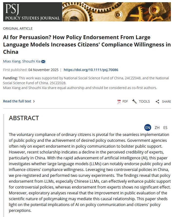 向淼老师合作的论文“AI for Persuasion? How Policy Endorsement From Large Language Models Increases Citizens’ Compliance Willingness in China”(《说服性人工智能?大语言模型的政策背书如何提升公众的政策遵从意愿》)于国际权威期刊Policy Studies Journal在线发表。Policy Studies Journal是美国政治学会(APSA)公共政策分会的旗舰期刊,是六间房