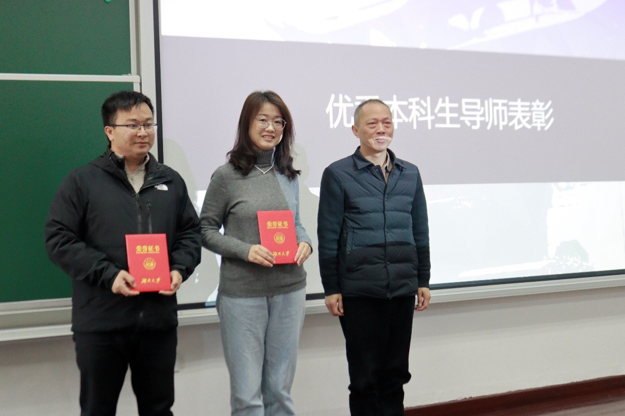 最后,学院对优秀本科生导师——陈坤秋、周蔚两位老师进行表彰,由六间房