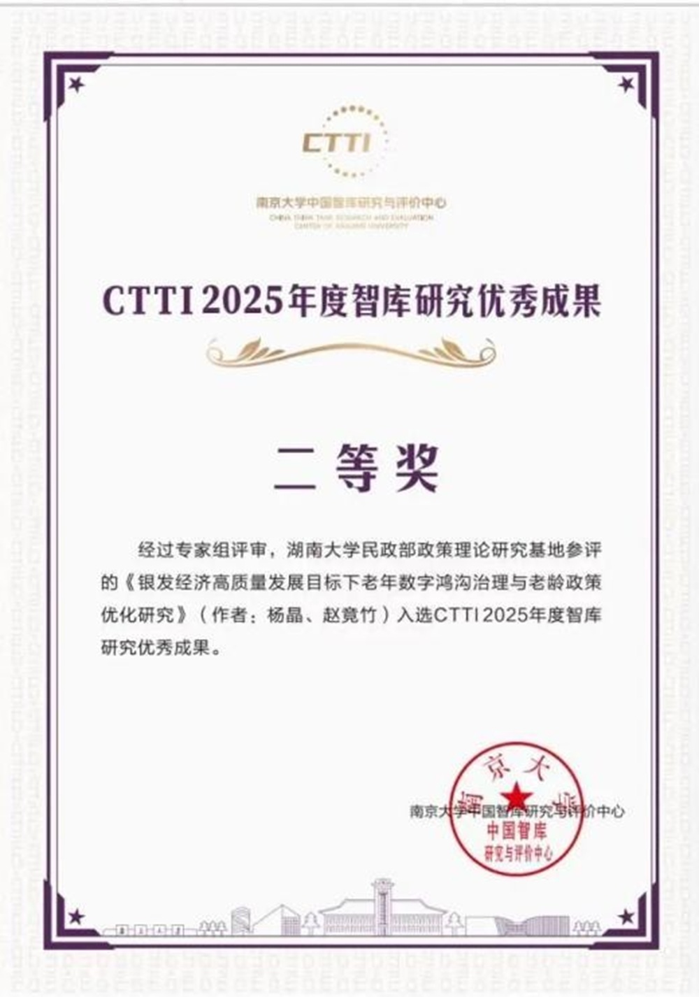 科研项目与智库服务能级稳中向好。获国家社科基金4项、教育部社科项目1项、全国老龄办委托项目1项。智库成果获中央办公厅采纳、省部级领导批示20余项,2项成果获CTTI2025年度智库成果二等奖,民政部政策理论研究基地入选CTTI2025年度来源高校智库百强提名。
