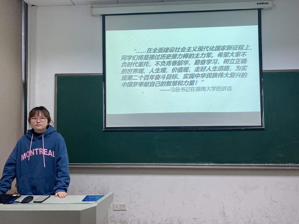 最后是第三部分“立足现在——习总书记寄语”。“在全面建设社会主义现代化国家新征程上,同学们将是接过历史接力棒的主力军。希望大家不负时代重托,不负青春韶华,勤奋学习,树立正确的世界观、人生观、价值观,走好人生道路,为实现第二个百年奋斗目标、实现中华民族伟大复兴的中国梦奉献自己的智慧和力量!”宋紫睿同学引用习主席寄语,号召同学们紧跟时代潮流,不畏困难,完善自身,积极担负起青年学子的责任,不负时代与人民的重托。