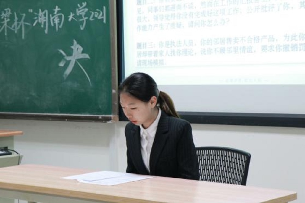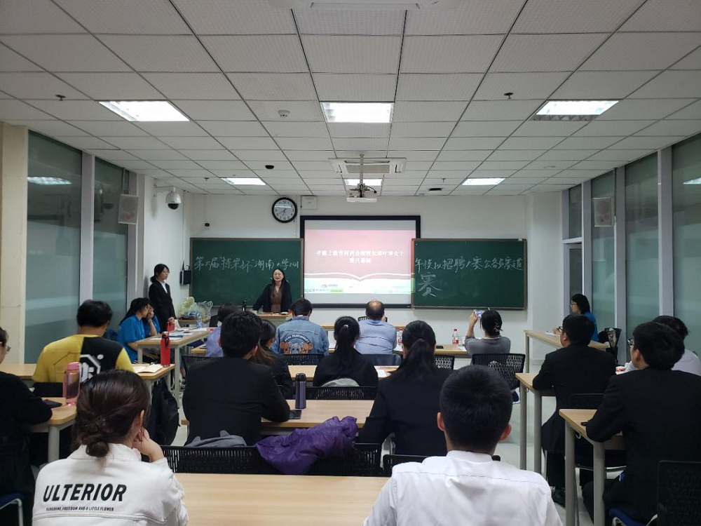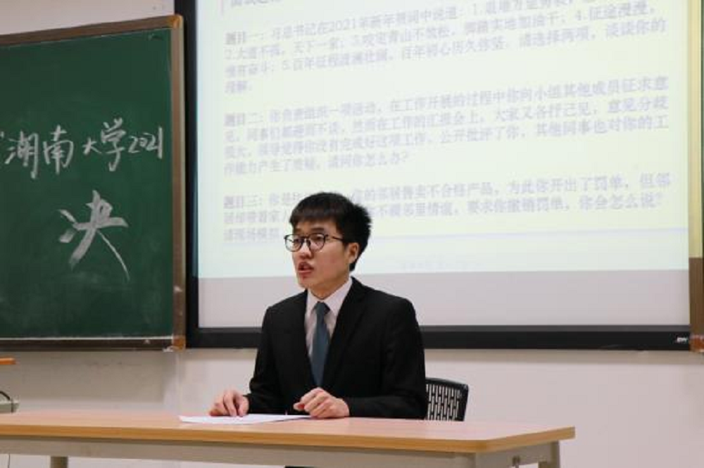 决赛正式开始前,主持人简单介绍到场的评委老师和比赛规则。随后,邓叶琴老师致开幕词。她指出,在后疫情时代,就业形势严峻,公考竞争激烈,备考需要提早准备、高度重视。致辞最后,邓老师预祝各位参赛选手在此次面试中取得好成绩。随后,面试正式开始。参赛选手们各扬所长,对试题深入思考并在作答时发表了自己的独到见解,评委老师综合考量学生的理解能力、言语表达能力、情绪稳定性、举止礼仪等各方面素质对选手现场打分。