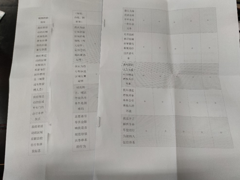 会后的实践活动中,小组成员们通过网络积极发放小组设计的调查问卷,共回收有效问卷185份。共享单车具有低碳环保、绿色出行的特点,共享单车不仅是共享经济的一种形态,同时也是人们绿色出行的选择之一。但通过对问卷的分析发现,虽然共享单车自出现以来给居民生活带来许多便利,较大程度上解决了“最后一公里”出行难题,提高了综合出行效率,亦满足了人们骑行和强身健体的需求。然而,近几年不少单车企业片面追求单车投放量与用户使用量,加上前期政府疏于监管,公民的规范使用意识不强,共享单车行业呈现出重使用而轻管理的局面。特别是共享单车在发展过程中却出现了乱停乱放、随意破坏、“私有化”共享单车等所造成的资源浪费和城市公共空间占用问题。鉴于共享单车公共性与便捷性的特点,使用者在停放共享单车时的责任意识相对薄弱。除了单车停放位置不当的问题,还存在虽然停放位置正确,但摆放“姿势”不整齐的现象。共享单车乱停放引发社会问题,一方面,造成市容的破坏和管理负担的增大;另一方面,给居民生活的带来不便,影响人们的出行,甚至存在磕伤绊倒等安全隐患。