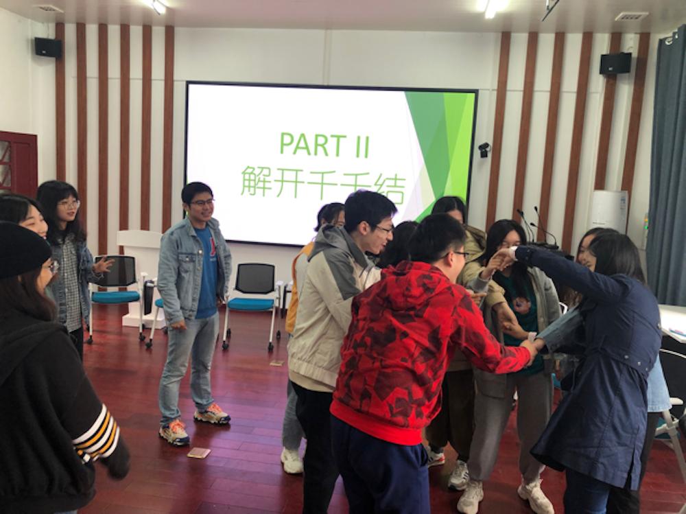 随后,刘老师带大家开展小游戏“解开千千结”,同学们先是两两牵手,随后所有同学随机围成一圈,每个人坚持两两牵手不松开,同时又相互配合,一点点调整位置,共同解开“千千结”。