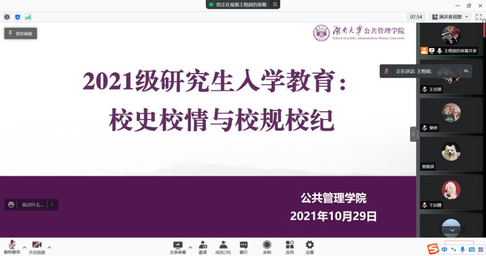 2021级研究生新生入学教育之“校史校情及校纪校规”学习活动通过腾讯会议线上开展。本次学习活动由六间房