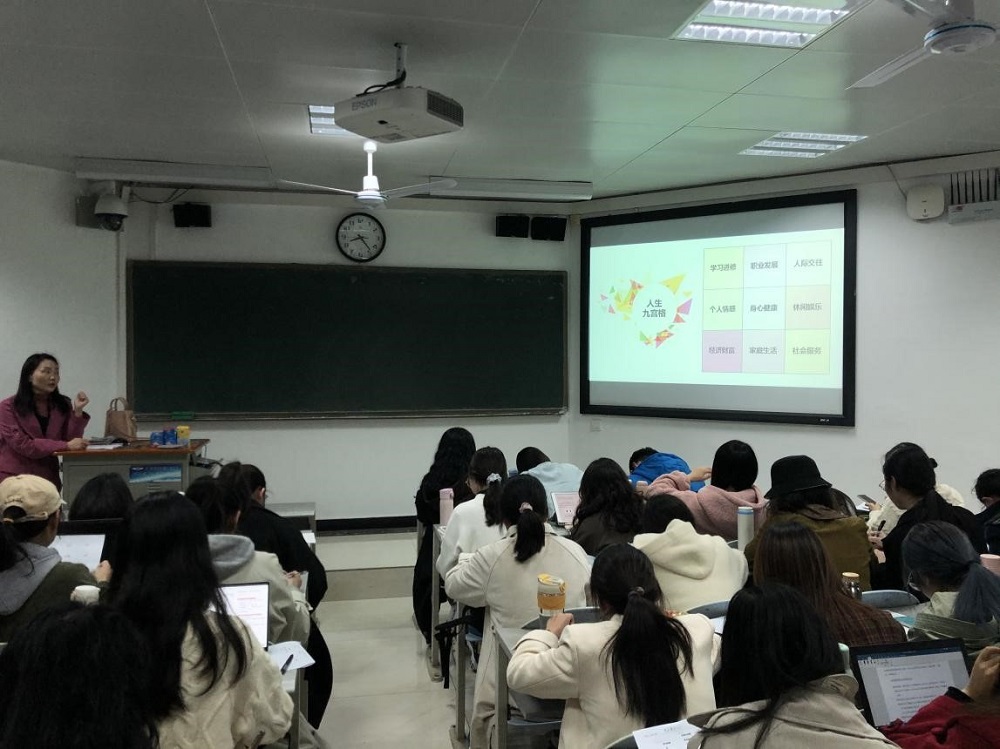 “生涯九宫格”包括学习进修、职业发展、人际交往、个人情感、身心健康、休闲娱乐、经济财富、家庭生活和生活服务九个维度,杨老师引导同学们评估并正视当下的状态,以完成度为自己打分,同时在背面写下自己2022年的“人生九宫格”计划,明确目标,坚定理想,更好地度过研究生生活,走好人生路。