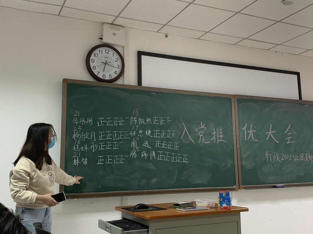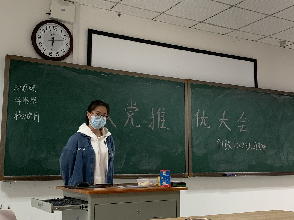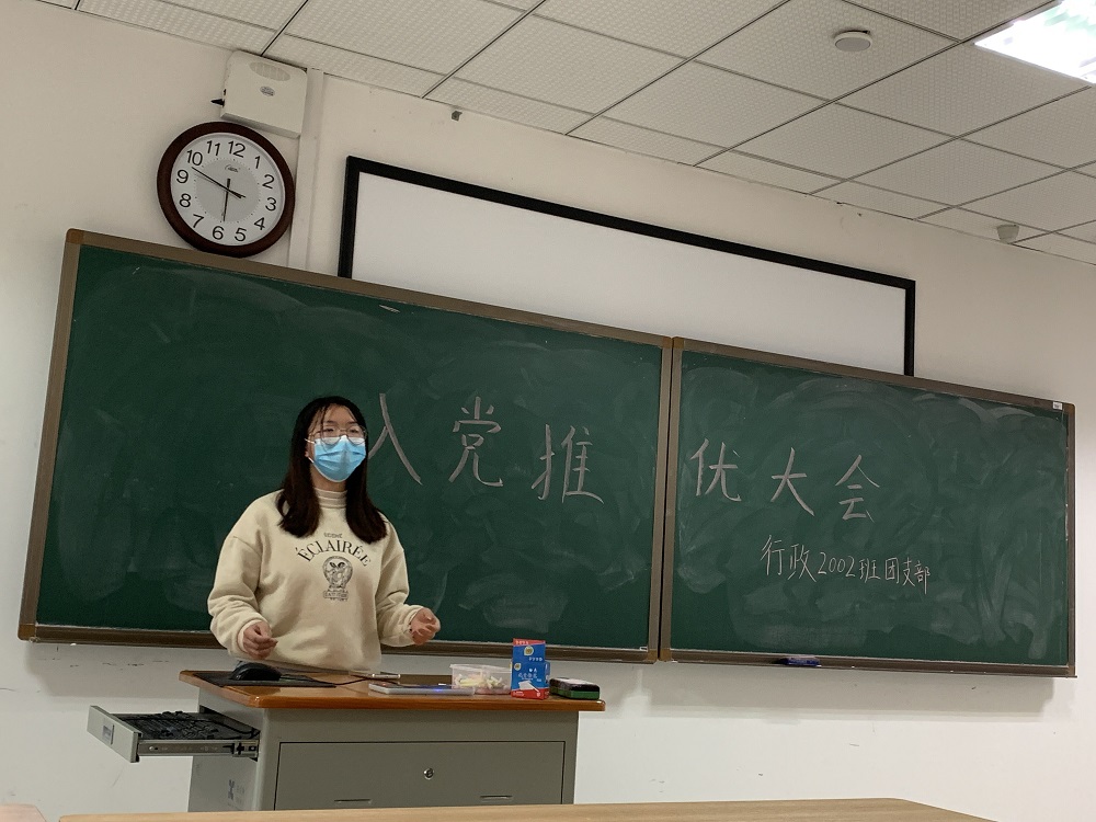 行政管理2002班团支部于研究生楼A302教室开展入党推优大会。会议由团支书马子舒同学主持,行管2002班团支部全体同学参加,团委组织部干事张译文同学全程监督。
