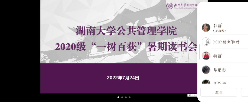 行政管理20级召开暑期“一树百获”线上读书会活动,本次活动在腾讯会议平台举行,由韩静同学主持,行政管理20级全体同学共同参与。
