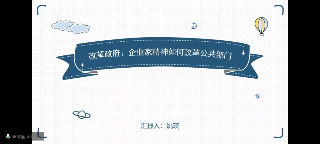 会议伊始,韩静同学对本次读书会活动进行简要介绍,使同学们了解活动背景和活动意义。随后,读书会正式开始。四位同学分别分享了自己阅读的书目,并就书籍内容提出了自己的简要见解。其中,蔡朋城同学、杨欣月同学、姚琪同学分享了有关《改革政府:企业家精神如何改革公共部门》的内容。蔡朋城同学从名人推荐入手,首先阐述了《改革政府》对于地方政府治理变革的重要意义。《改革政府》作为“享誉全球的政府管理权威作品”,提出了著名的十大“药方”。在有选择性地对十大原则进行分享后,蔡朋城同学提出了问题,即改革政府的十条原则对于当前中国政府改革有怎样的借鉴意义。而后,杨欣月同学从中国具体实践出发,分析了改革政府的十大原则在中国社会实践中的运用。与蔡朋城、杨欣月两位同学不同的是,姚琪同学采取了更加微观的角度,具体描述了“竞争性”政府这一原则的深层含义并分享了相关案例。