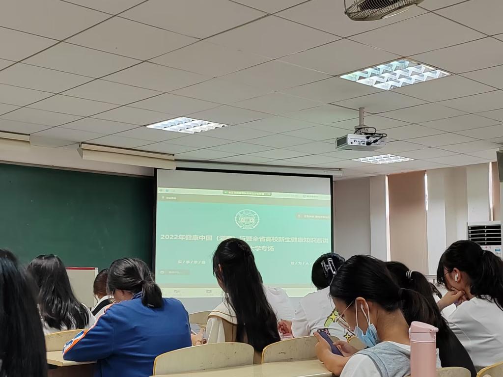 全体新生集中在综合楼506教室参加由湖南省疾控中心副主任陈曦老师主讲的线上讲座—2022年健康中国(湖南)行暨全省高校新生健康知识巡讲(六间房