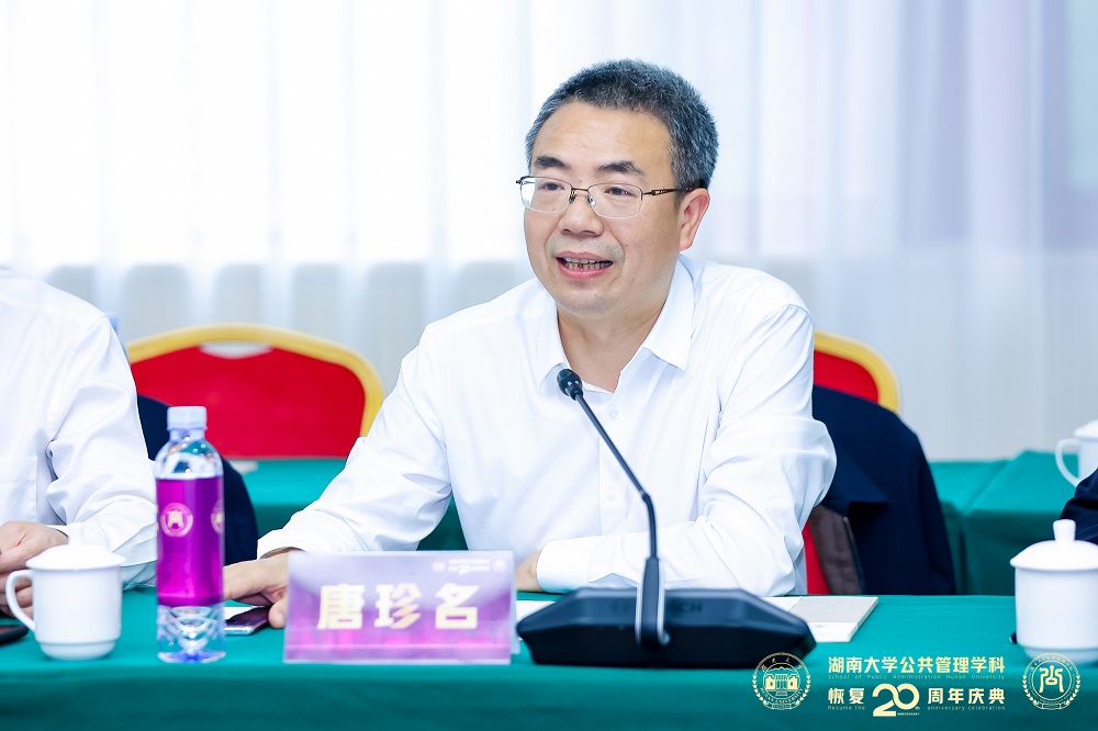 唐珍名代表学校致辞。他对与会嘉宾的到来表示热忱欢迎和衷心感谢,对《岳麓公共治理》期刊创办工作表示充分肯定和支持。他指出,期刊作为学术成果的载体,关系到学科的发展和学术生态的建设,《岳麓公共治理》的创办是我校公共管理学科发展的里程碑,期刊能实现从零到一的突破,是全体成员齐心协力、团结奋斗的结果,应当悉心呵护、加倍珍惜。期刊今后应担当起赋能学科发展、推动国家治理现代化建设的光荣使命,建设具有国际视野、中国特色、湖大风格的高水平期刊。同时,唐珍名热切期盼广大学者持续关注《岳麓公共治理》,助力其建设成一流水准的公共管理期刊。