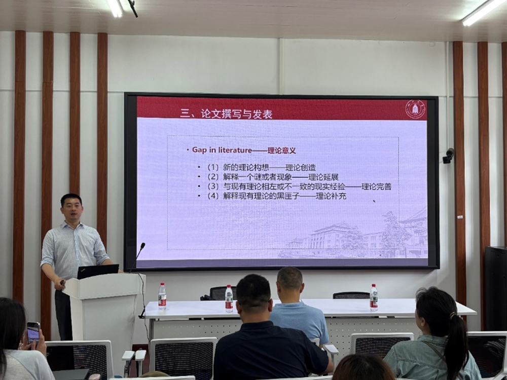随后,张教授系统阐述了高水平学术论文撰写与发表的核心策略。他强调了扎实的理论功底是构建严谨研究框架的前提,并鼓励同学们掌握并灵活运用包括定量、定性及混合研究在内的多种方法。针对管理学论文的理论贡献,张教授将其归纳为延展、完善、补充和发展四类。他还就论文写作技巧、期刊选择、理解审稿人关注点以及在国际视野下关注中国情境等问题给出了具体建议。
